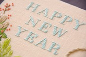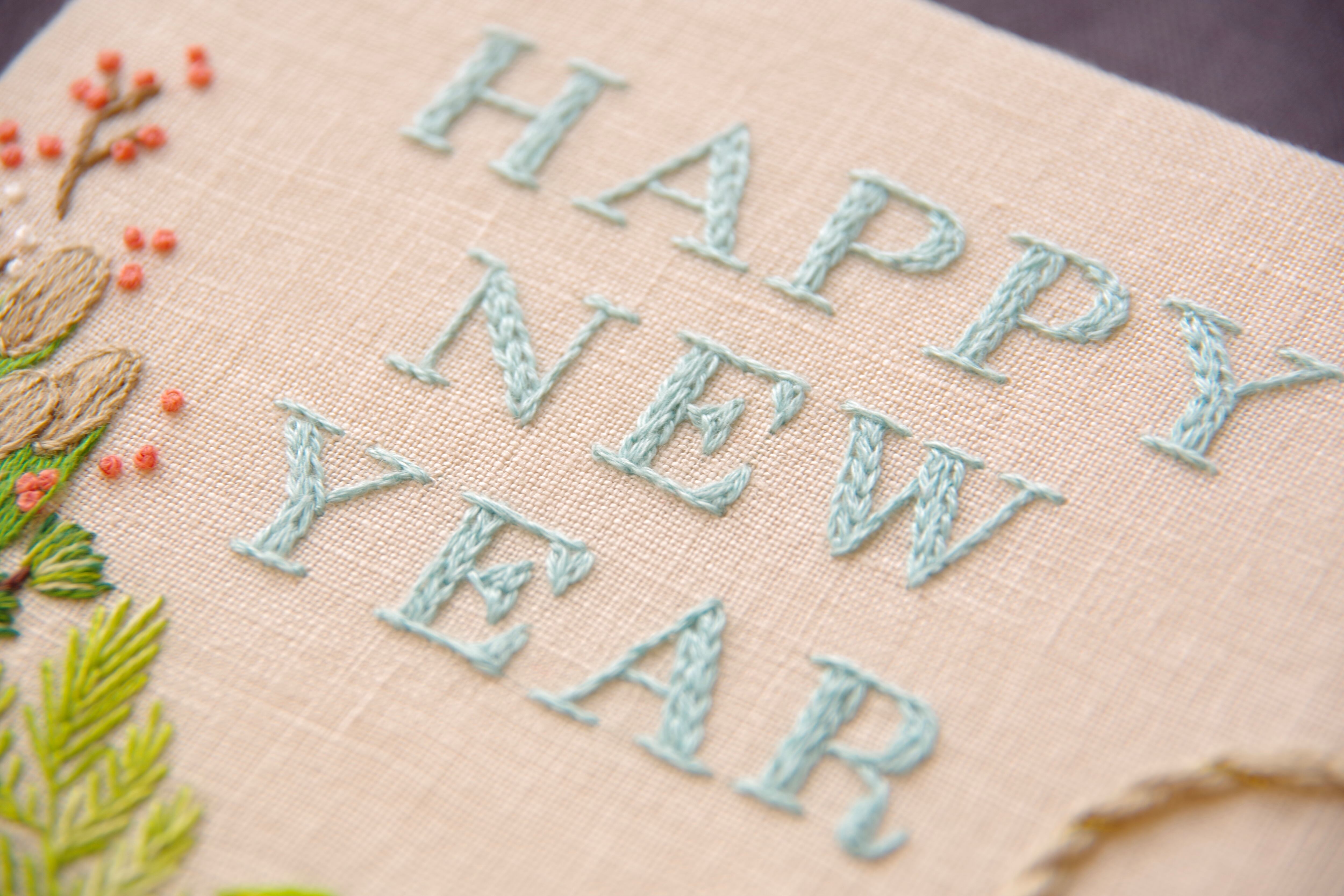 椿・しめ縄・門松・梅・南天・裏白、縁起物をぎゅっと詰め込んで刺繍しました。福を招いて、よいことがたくさんありますように。